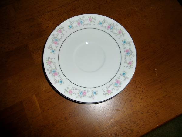 * FINE CHINA by Dynasty ~ Rapture Pattern. 16 places + 2 serving platters and 2 serving bowls. Design: Features a white base with a floral band of small pink and blue flowers and green leaves. 70...