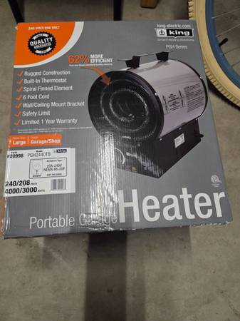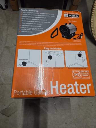 King electric portable garage heater. BRAND NEW, still in the box, free standing or wall/ceiling mount. All hardware included. 240 volt electric connection needed.