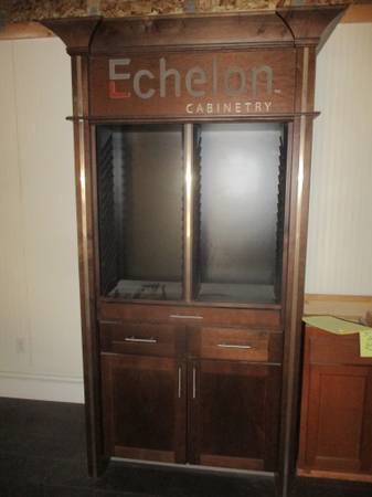 We have a 42" wide and 84" tall cabinet. It was used as a display cabinet and has the manufacturer's name on it. It has a couple drawers and some shelves that pull out in the bottom cabinets.
