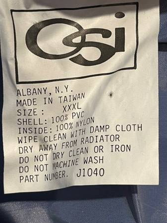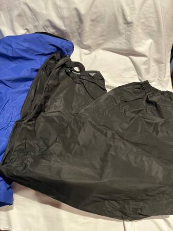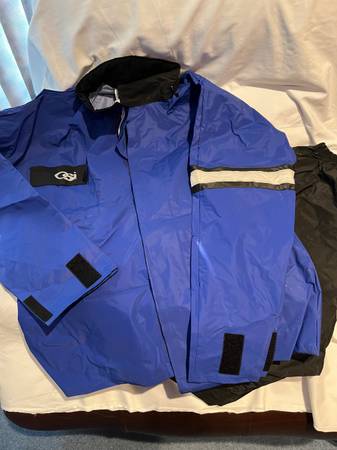 "OSI" Waterproof Rain Suit Size 3XL Blue Jacket with Stripes on Arms, Hidden Hood inside Stand-up Collar Black Elastic-Waist Pants Made for Motorcycling, but perfect for Boating, Hunting, or any...