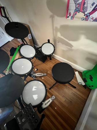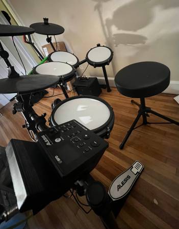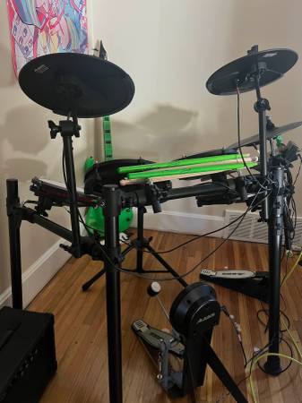 Comes with 3 sets of drum sticks, including electric green sticks, black cable for an amp, & throne (stool). Opened & tested, still has plastic wrap on module. Comes with built-in practice timer, preset songs, sounds, ability to record, and Bluetooth so you can use it as a speaker or play along to your favorite songs. Comes with 440+ preloaded songs/sounds. Original Bundle Price: $536.53