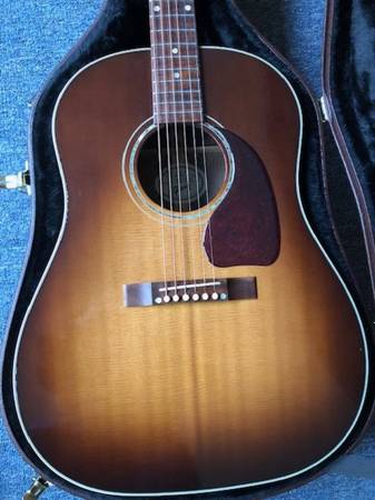 Gibson J-15 with spruce top and walnut back and sides. Good condition. Small ding on the back side of the neck near the heel joint. Beautiful burst finish. Cash only.