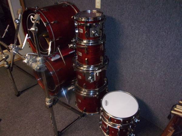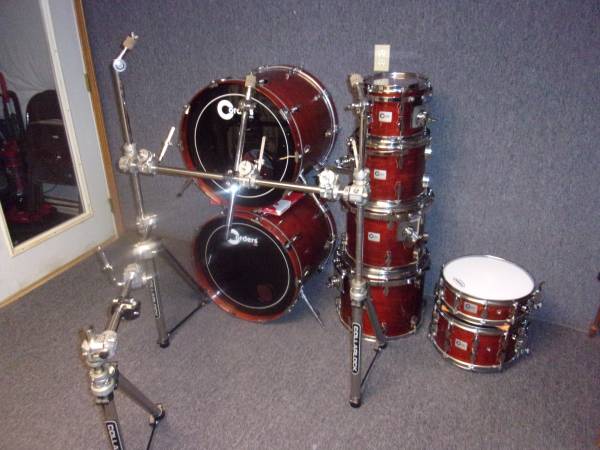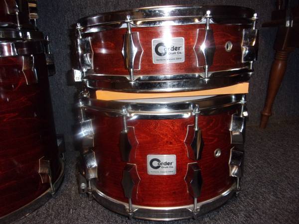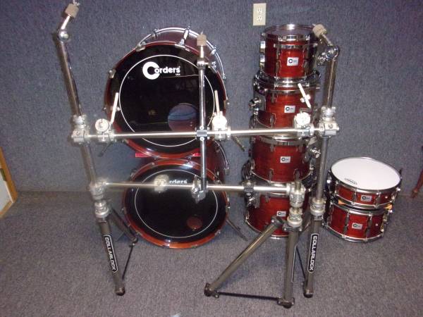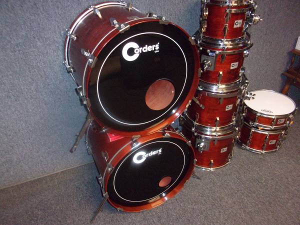 For sale is a late 1980's Corders 8 piece drum set. This kit was made in Huntsville, Alabama USA. Here's a brief history of the Corders Drum Company; the company was created by Jim Corder in 1979, following the purchase of the dies, moulds and tooling of the Fibes Drum Company (founded in 1966) from its then owner, the C. F. Martin & Company. Jim Corder produced these wood shelled drums under his name from 1979 through 1990 and then sold the company to Sammy Darwin (Darwin Drums) in 1990. Sammy Darwin produced drums under his name using much of the same tooling until 1994 and then re-sold the Darwin Drum Company back to Fibes in late 1994. I purchased the set pictured in early 1990 which has been used only by me in a studio setting. It's finished in a rare factory red mahogany lacquer and includes; 2 - 18x22 bass drums, 10", 12", 14" and 16" toms (all virgin Jasper shells) using RIMS mounts and 2 matching snare drums 4x14" and 8x14". Everything mounted on a Collar Lock rack system. I believe this kit to be the nicest all original Corders drum set on the planet. These pictures just don't do justice to how nice this kit is and how well it sounds. I put new heads throughout the kit. Asking $1900 or, best offer. Drums and rack only. If interested please contact me for specific details. No third party sales. Thank you