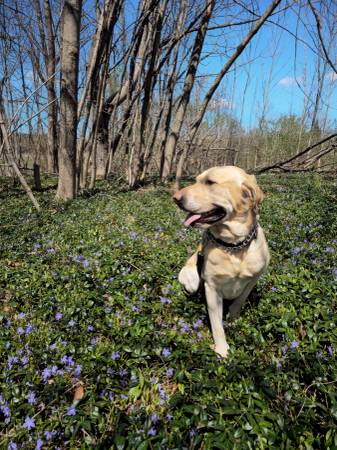 Unfortunately have to re home this sweet baby due to no fault of his own. He randomly showed up earlier this year and we rescued him so he wouldn't be put down. Unfortunately now medical issues of my own it's just too much. Age is estimated 3-5. Breed is estimated as yellow lab. Aprox 60lbs. Knows commands very well. Very well trained. Rabies vax in April of this year. Not fixed. Very well with other dogs and children. Serious inquiries only. Rehoming fee applies to ensure good home.