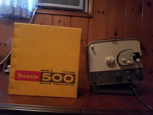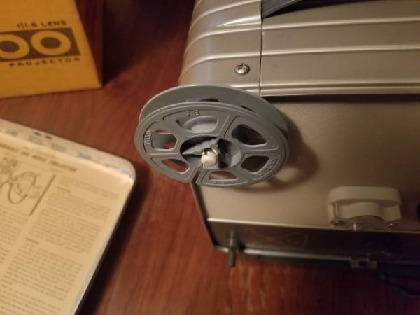 Kodak Brownie 500 8mm projector. The top spindle has a slight tear, however it still holds the reel firmly. Needs light bulb.