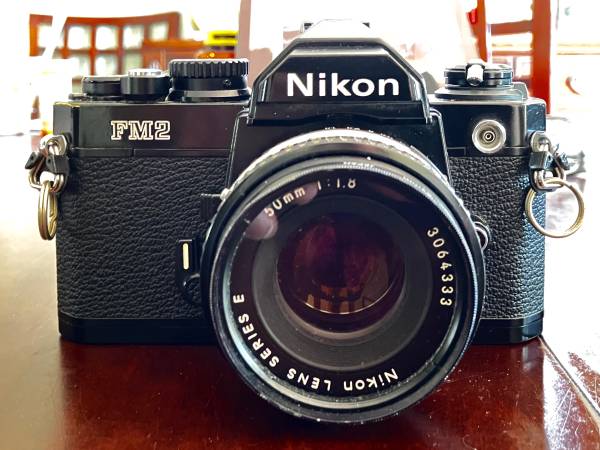 Near mint, original owner purchased 1983. All mechanical (battery runs meter only), black all metal body, titanium shutter B to 1/4000, multi exposure switch, hot shoe and flash sync 1/250, self timer, depth of field preview button, center-weighted meter, aperture and speed in viewfinder, accepts Nikon motor drive (not incl.), with Nikon E series 50mm f/1.8 lens, Sigma 24mm f/2.8 wide angle lens and case. Strap.