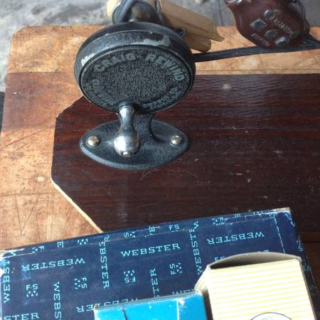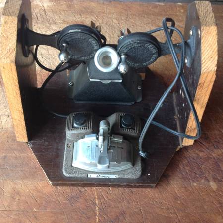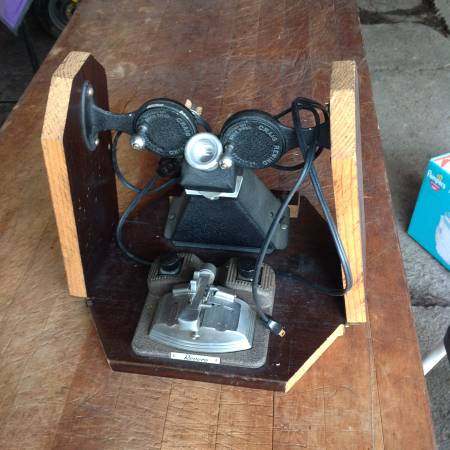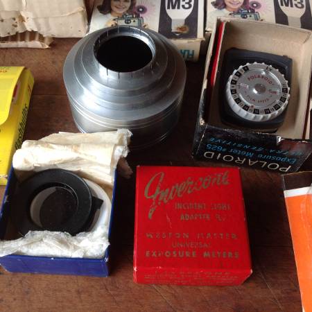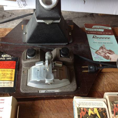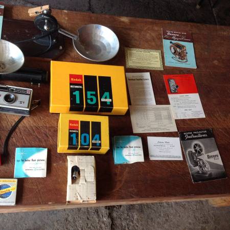 Box full of vintage camera equipment. Revere film splicer, lenses, camera, empty Kodak boxes, bulbs, manuals, Delaware Camera Mart and lots more.