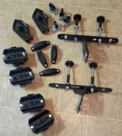 Rhino car roof rack ( must already have cross members). Size: 48"×38" (4) clamps (2) may have to be replaced depending on vehicle) (4)ring tie downs, (4) wrap around tie downs ,(2) tool clamps (shovel etc.) (2) escape track clamps. This was mounted on Ford bronco sport. $500 or BO for everything $400 or BO for rack and clamps only. Cash only