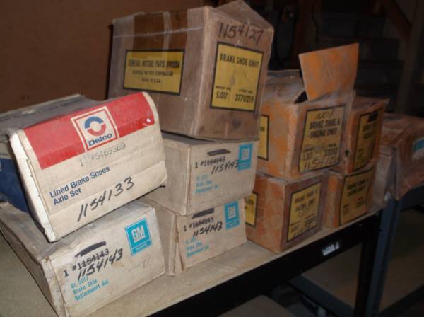 11 sets of GM NOS brake shoes from 50's thru 70's, don't know the application, here is some of the information. 4 sets GM part number 1154143- 9 1/2 x 2 1/2 inches, 4 sets of 3703513- replaced by 1154126-12 x 2 inches, 1 set 3772019- replaced by 1154127-11x2 3/4 inches, 1 set 1154133- replaced by 5469369- 12x 2 1/2 inches, and 1 set 3996681, these are 5 inches wide, hard to estimate the diameter. All 11 for 125.00, good for E-bay items. No shipping, you pick up.