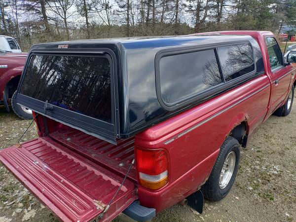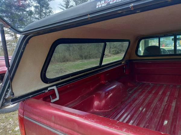 Black fiberglass bed cap for 1994 to 2004 Chevrolet S10 GMC Sonoma long bed in nice shape. I was informed by the gentleman that put this bed cap on this 1994 7 ft Ranger bed that this cap was off a 2000 S 10 long box. That makes sense considering the slight overhang.