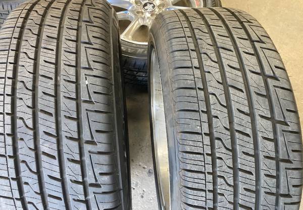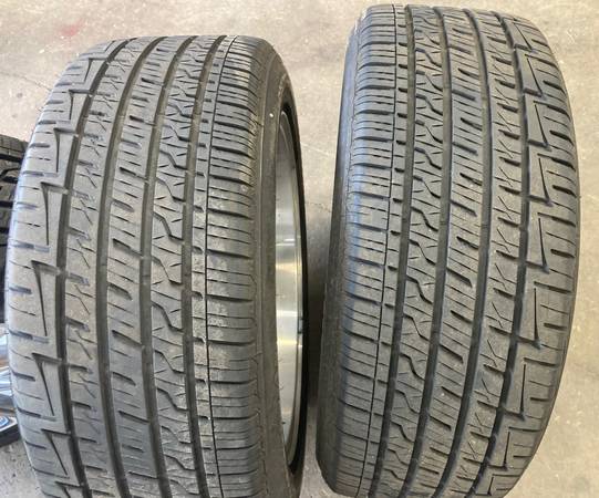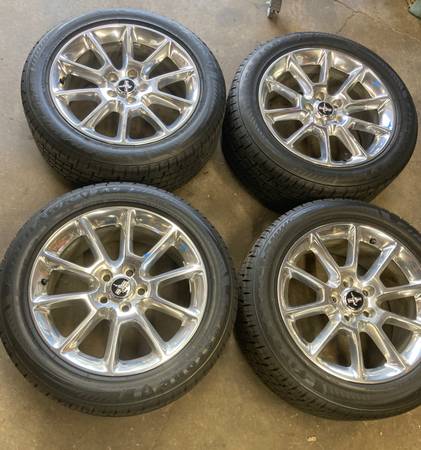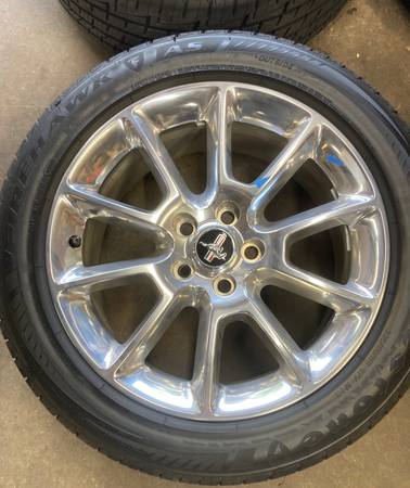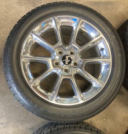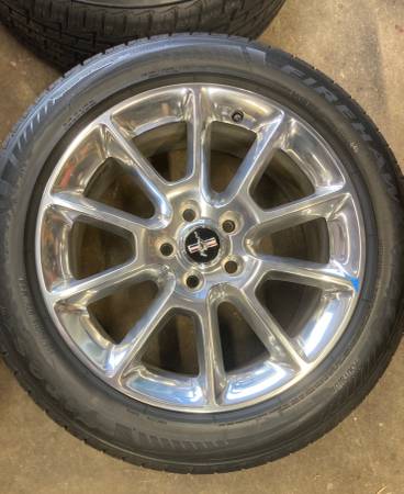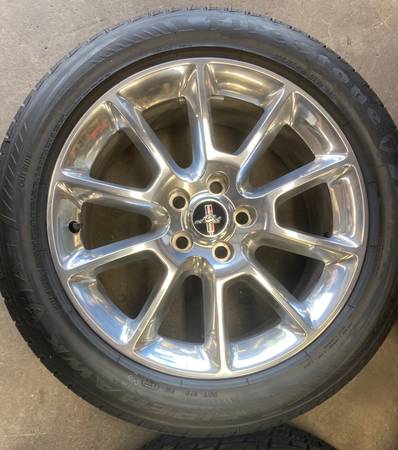 OEM original set of four, 2011 Ford Mustang polished aluminum (chrome like shine) wheels with Firestone Firehawk AS 235/50R18 tires.