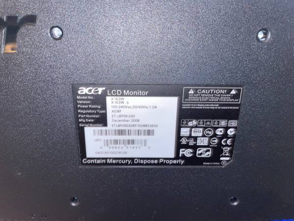 I have for sale a Acer x163w Widescreen Monitor. In excellent condition. Nice little monitor for limited space when you just need work on computer and need a monitor or a extra monitor to display something off to the side. I would love to keep it but I have a few more monitors and need the room. I have the original box if you want that too.