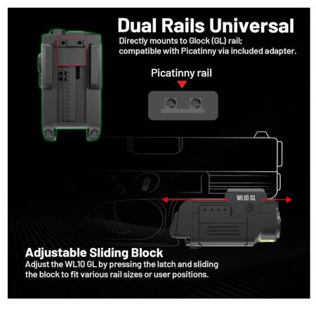 Universal Rail Fit: Designed to fit both compact and full size handguns, the WL10GL features an adjustable rail stopper for a secure and custom fit on GL and 1913 Picatinny rails. The effortless slide and lock system ensures a quick and secure attachment. No tools, no hassle just a solid, reliable fit across multiple firearm platforms