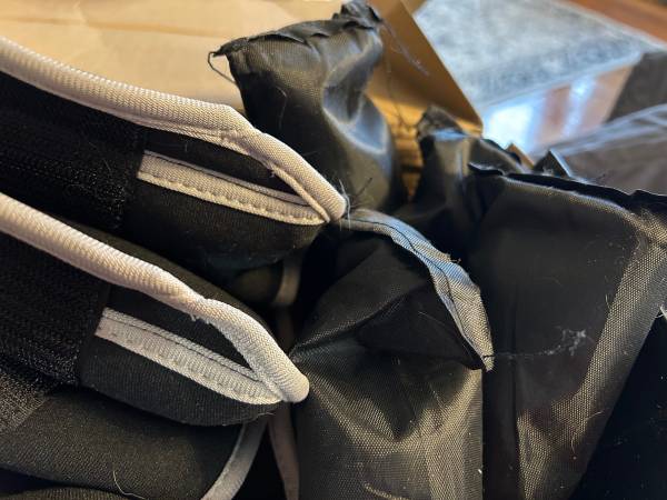 Ambor Adjustable Ankle Weights. 5 lbs each weight for a total of 10 lbs. strong breathable cotton material with iron pellets (not sand) and reinforced double stitching. Mesh bag included for storage.
