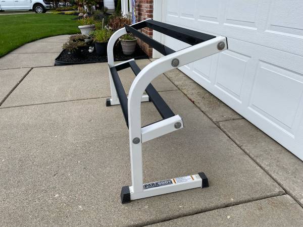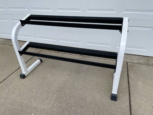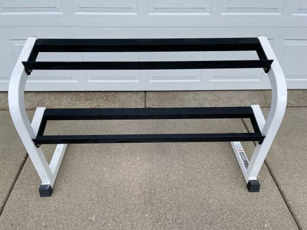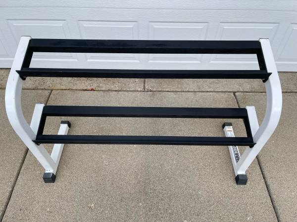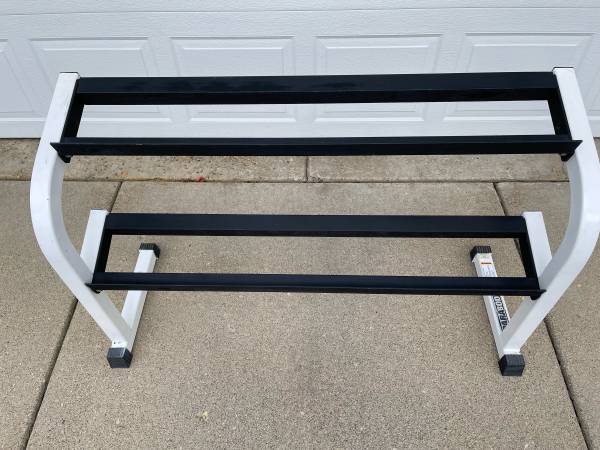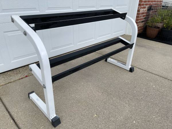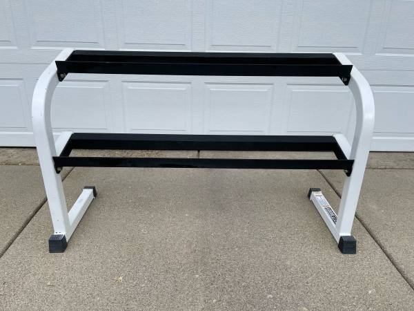 “PARABODY” HEAVY DUTY 2 TIER DUMBBELL RACK - MADE IN U.S.A. MAXIMUM EXTERIOR DIMENSIONS OF FRAME: - 52”W x 18 1/2”D x 31 1/2”H - MAX INSIDE RACK WIDTH: 47 1/3”