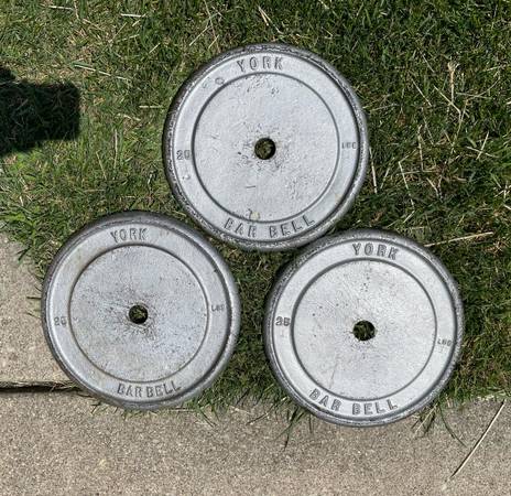 “YORK” 3 - 25 pound STANDARD WEIGHT PLATES 75 POUNDS TOTAL WEIGHT 90 CENTS/POUND $67