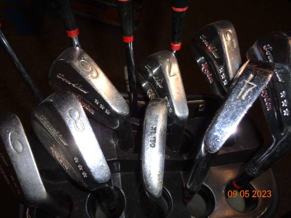 Kroydon Tom Shaw set of vintage mens golf clubs. Woods: 1,2,3,4. Irons:3,4,5,6,7,8,9. Putter: XL150. Clubs in good condition, bag and cart ok