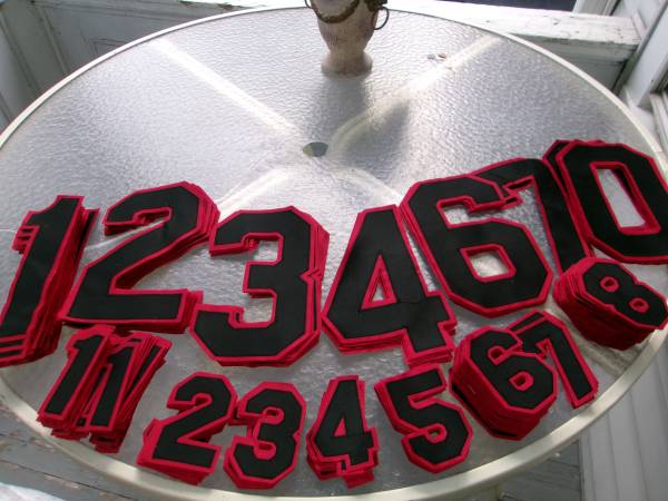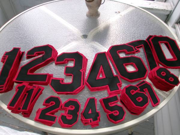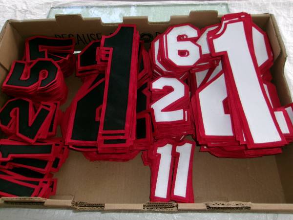 * * * JERSEY NUMBER patches: 2 colors and 2 sizes. ..... 1.} 293 black/red Tackle Twill Jersey Numbers 86 black/red 10 1/2" X 6" $6.00 each = 86/$516. 207 black/red 4 1/ 2" X 3" $4.00 each =...