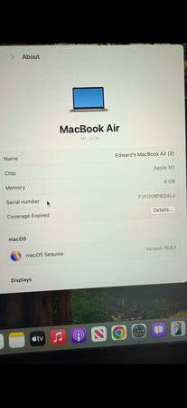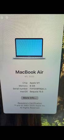 2020 MacBook Air M1 Lightly used excellent condition no issues 8gb 256gb HD running current Tahoe .