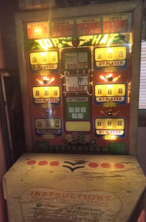 1950s era United puck bowler. Back-glass has some previous flaking, was sealed by clear coat. The coin mech was removed and a "by pass" button was installed by the previous owner. The pins are in good condition and the playfield is excellent. We never used the "wax compound" for the bed, we stuck a piece of fine felt to the spare puck and it works just as well without damaging the bed surface.