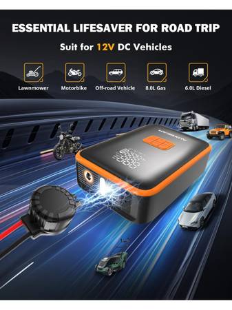 🔋Military-Grade Toughness, 10x Safer: UL/FCC certified, this jump starter with air compressor has 10 layers of protection against sparks, surges, and rookie mistakes.Drop it? The rugged ABS shell laughs off bumps. Trust us—it's built like a tank but light as a paperback.