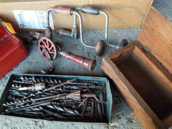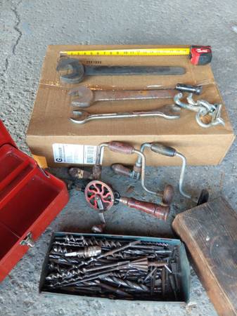Lot of antique vintage tools, wrenches, drills, tool box $15.oo for all or reasonable offer