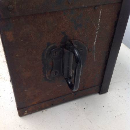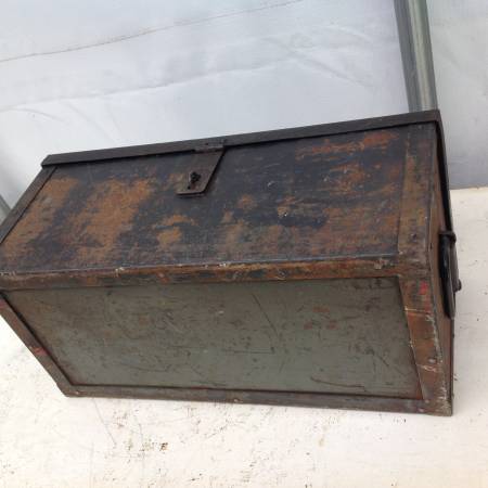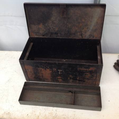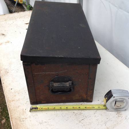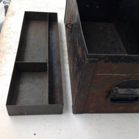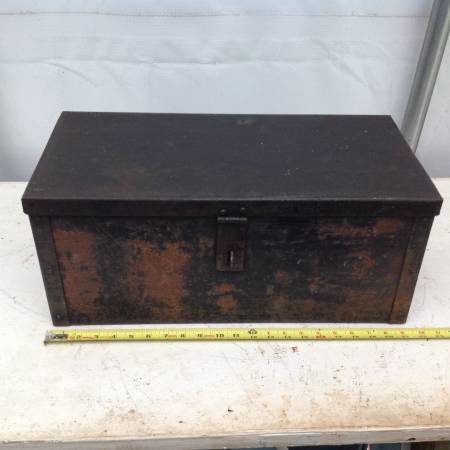 Super heavy duty tool chest 21-1/2" wide x 10-1/2" x 9-1/4" tall. Interior tray. Handles and hasp for lock.