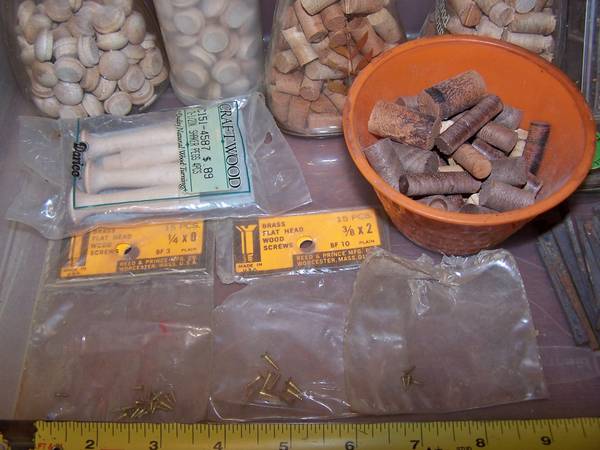 Woodworking - wood plugs,square cut nails,brass screws,case,vintage...