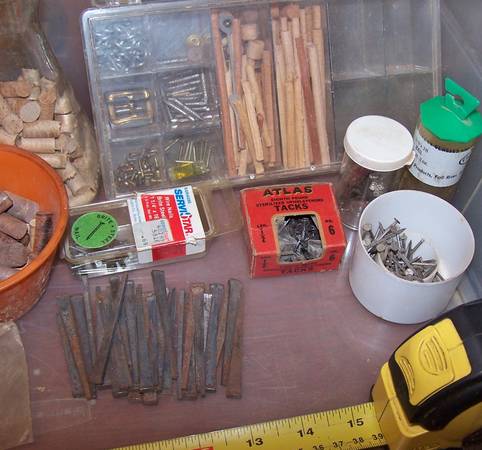 Vintage antique woodworkers hardware and supplies. Wood pegs, plugs, buttons, dowels, square cut nails, brass screws, tacks, parts bin case, etc. Tape measure not included. Asking $10. 44O-45twoO