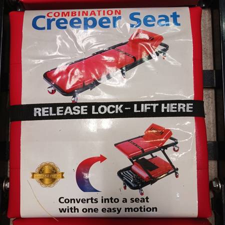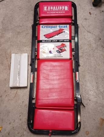 New complete Excalibur Tool convertible creeper seat for auto car truck mechanic use. The casters/wheels are in the white cardboard box. Never opened, assembled or used. Use as a rolling work stool with tool storage tray or fold down flat and use as a creeper under your vehicle.