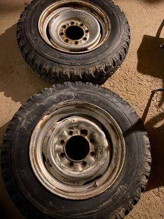 2 Studded snow tires on Chevy/Ford 3/4 Ton wheels both $30 FIRM
