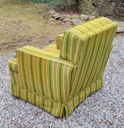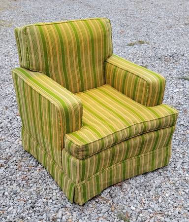 Hi there. I have an old armchair on offer, free to whoever wants it. It was last re-upholstered in the '70s (as you can tell), but it predates that era. It is clean and still has solid bones and good cushioning. Feel free to contact me with any questions. My name is Wyeth. You must pick up. Thanks for looking!