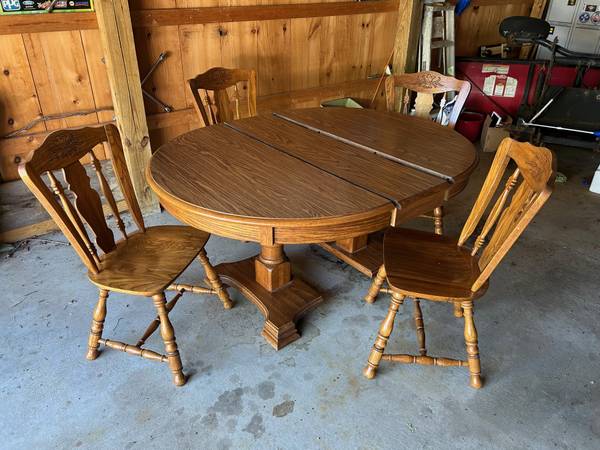 Dining room set, Oak with laminated top. Table with center leaf and 4 chairs. 48” x 60” with leaf. Solid and strong in very good condition with one indent on top. Likely from 1995. See photo.